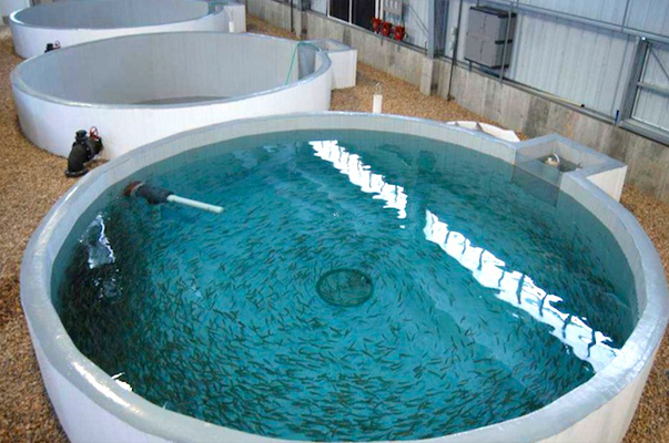 This would either be attached to the hatchery or could be in a separate location – this facility is where the fingerlings are grown out. A grow out facility consists of numerous large tanks and as the fingerlings grow in size, they are moved from one tank to another.